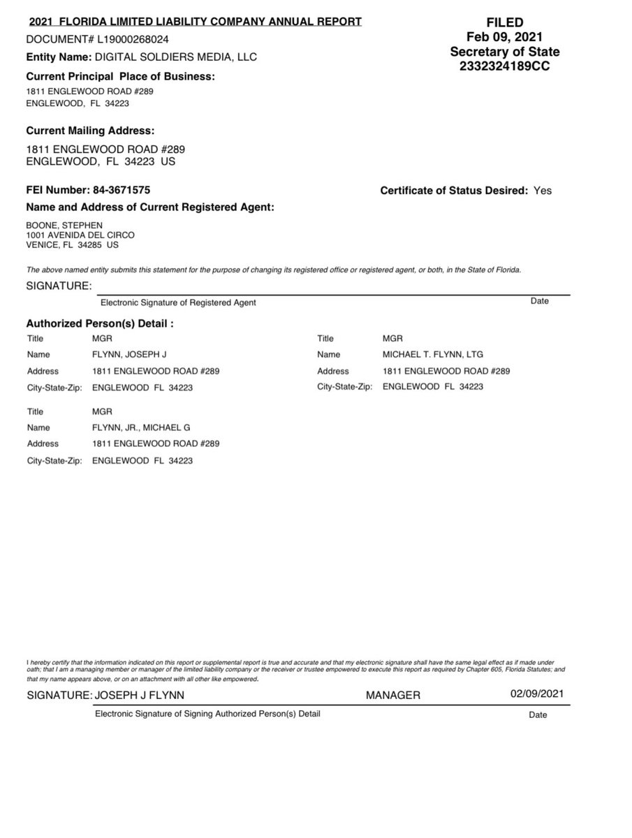 By October 2019, Flynn’s “digital soldiers” websites were joined by a real-world company: Digital Soldiers Media, LLC. Florida public records list Flynn,