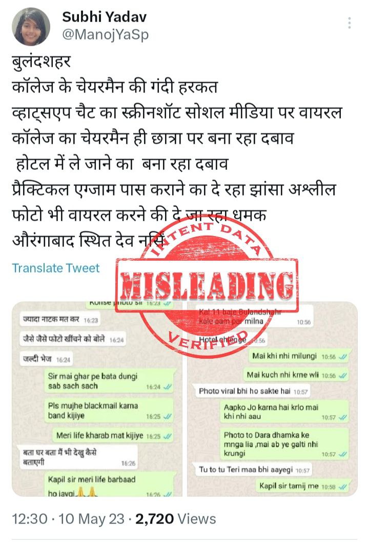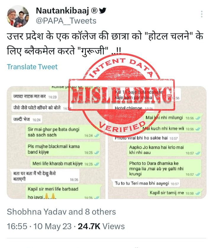 FACT: Screenshots of a WhatsApp chat are being circulated with false claims that a college teacher blackmailed a girl student, pressured her to visit a hotel with him, and threatened her to make her photos viral. (1/4)