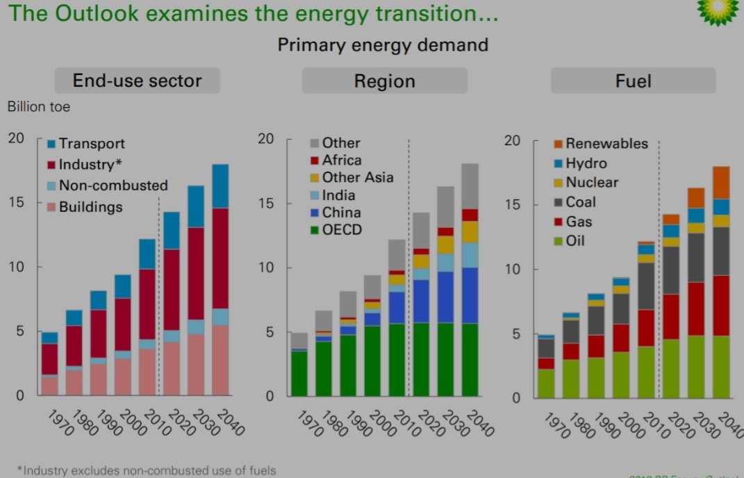 Abb. Mitte: Dass die Nachfrage nach Energie in den Ländern der OECD, (nicht etwa nur Deutschland) seit 2010 ungefähr gleich geblieben ist, hat KEINEN Effekt darauf, dass der primäre Energieverbrauch weltweit steigt, und zwar in China, Asien und Afrika.