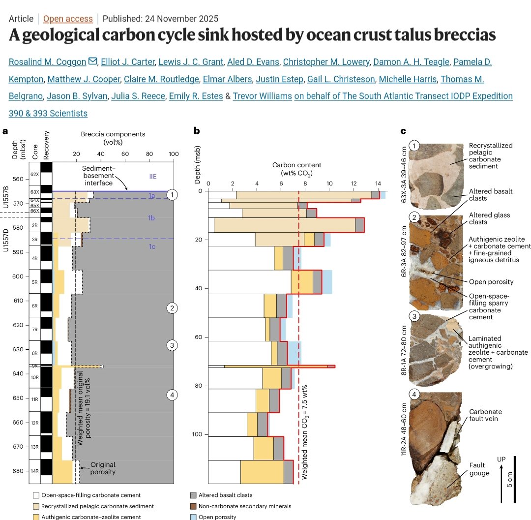 ๐จNew study reveals a major hidden C sink in the deep ocean: ancient talus breccias - piles of broken basalt formed along seafloor faults - can trap & store COโ for tens of millions of years, potentially offsetting a significant share of mid-ocean ridge emissions.