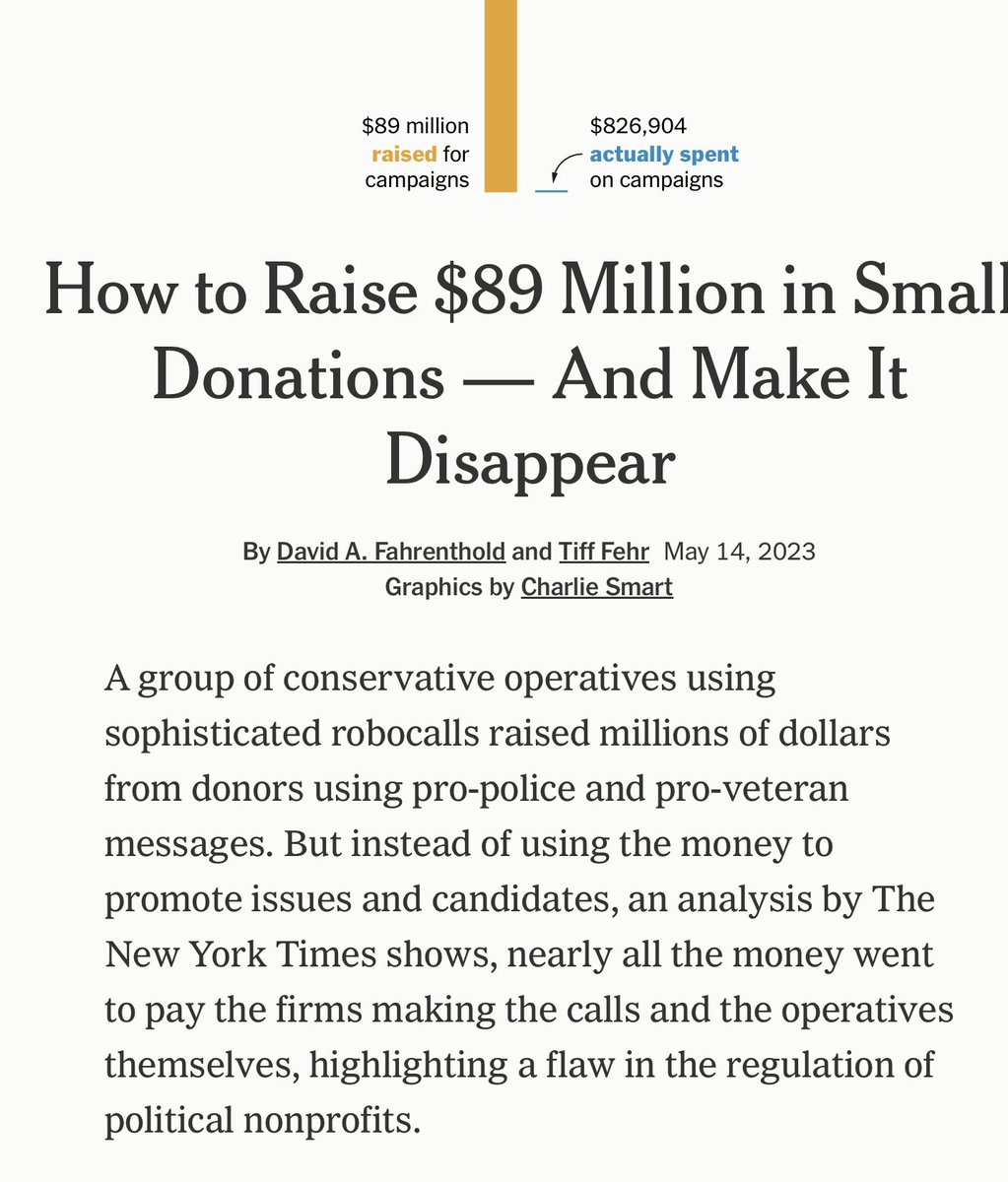 Great exposé of decade-long grift by 3 young right-wingers—created nonprofit fronts, raised $10M a year from donors, their marketing firms kept 99% of the money. Met as college Republicans—but no mention here of their Koch network training along the way. 1/2
