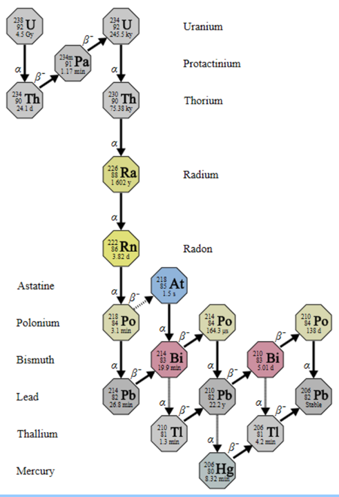 Ten je totiž přirozeně radioaktivní a postupně se přeměňuje na thorium 234, pak na protaktinium 234 a pak, postupně, na dalších 12 různých radioaktivních izotopů. Až z něj na konci vznikne stabilní olovo 206.
