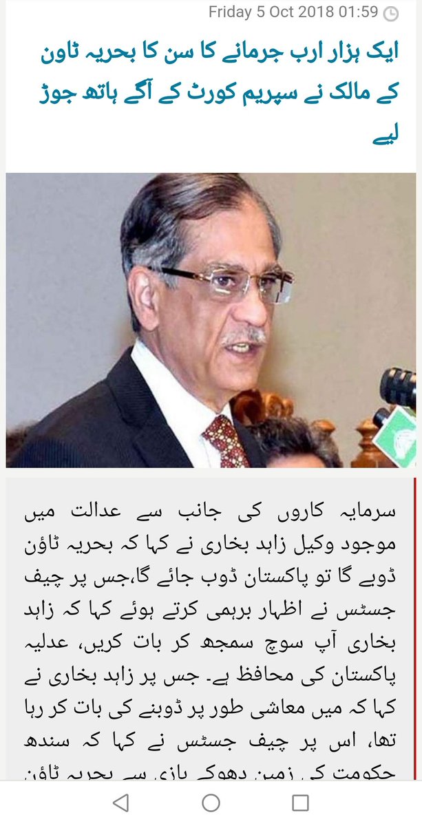 ملک ریاض نے اتنا جرمانہ دینے سے معذرت کرلی اور چیف جسٹس سے کہا کہ آپ نے میرے بیٹے کے گھر کا ذکر کیا تھا وہ میں آپ کو تحفے میں دینے کو تیار ہوں لیکن میں اتنا جرمانہ نہیں بھر سکتا۔