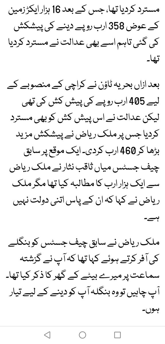 کیا 1000 ارب کو 460 ارب کرنے میں ثاقب نثار کا کوئی فائدہ نہیں ہوا؟ 1000 ارب اگر تخمینہ تھا تو ظاہر مارکیٹ ریٹ پر حساب لگا کر بنایا گیا تھا پھر 460 ارب میں سپریم کورٹ کیسے مان گئی؟ ملک ریاض کی طرف سے گھر کی آفر کے بعد ثاقب نثار اور ججز نے کیا وصول کر 1000 ارب کو 460 ارب کر دیا؟