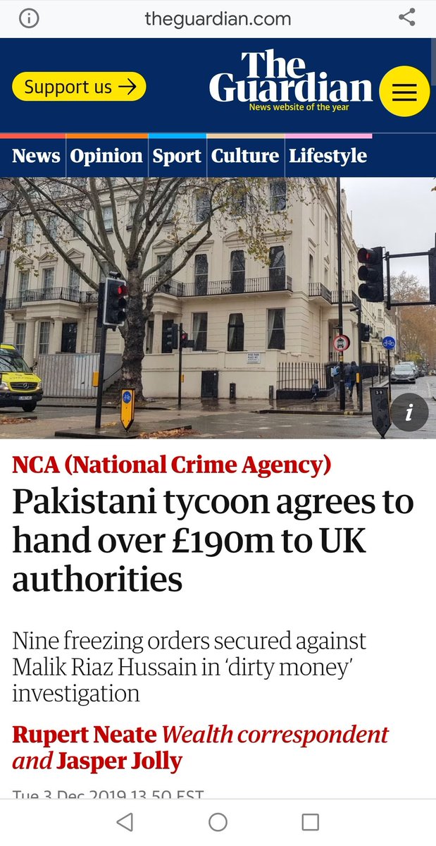 این سی اے برطانوی کرائم ایجنسی ہے جو اندرون اور بیرون ملک پیسے کی غیر قانونی ترسیل اور منی لانڈرنگ کو دیکھتی ہے۔ ملک ریاض اور اس کا خاندان "ڈرٹی منی" کے معاملے میں NCA کے ہتھے چڑھ گیا۔ 190 ملین پاؤنڈ کا تصفیہ ہوا اور این سی اے نے قرار دیا کہ پاکستانی عوام اور حکومت کا پیسہ ہے