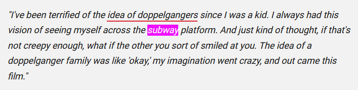 I looked up Peele’s bio and read that he was a native New Yorker. I then saw a quote in an article about his movie Us re: a childhood memory involving an NYC subway platform and doppelgangers.