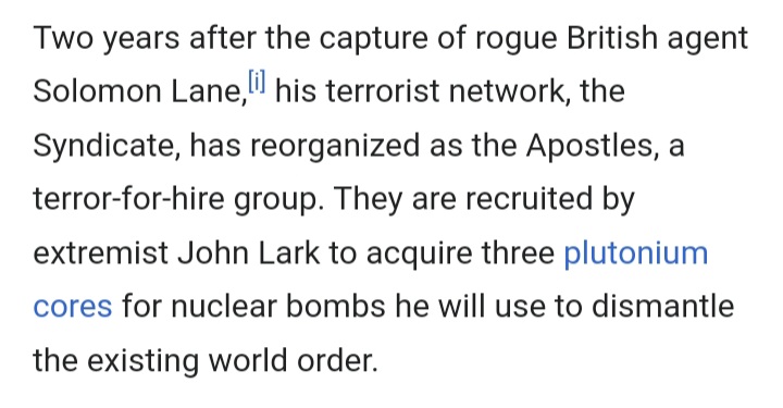 The plot involves a terrorist group headed by Solomon Lane who Hunt captured in the previous film. The group seeks to destroy the existing world order by setting off nukes. They say the captured Lane is now absent from the "world stage."