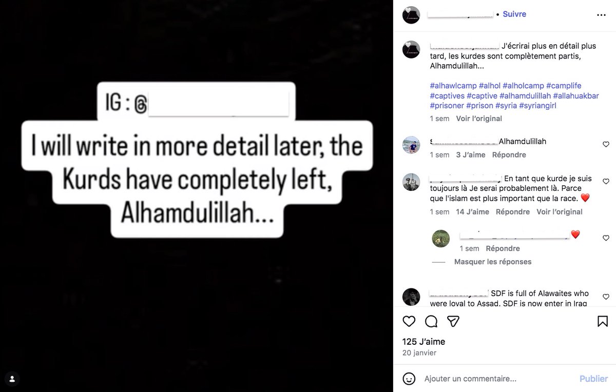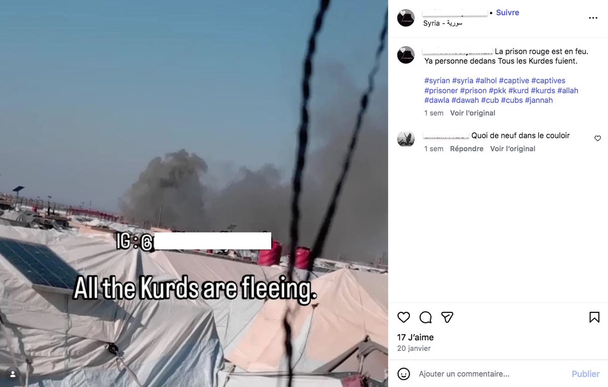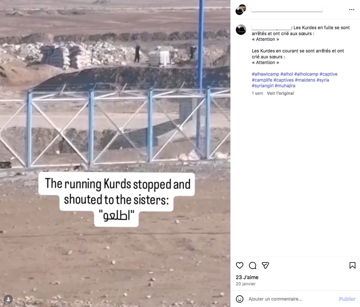 Le 20 janvier 2026, le camp d’#alHol a été repris aux forces kurdes par la nouvelle armée syrienne. Sur Instagram, une prisonnière a décrit le déroulement des faits dans une story :