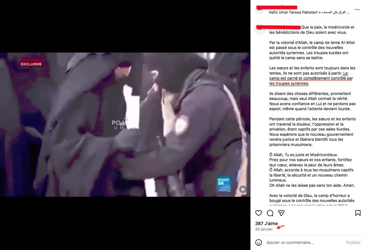 Comme nous allons le constater, le camp n’a pas été évacué, mais certaines « sœurs ont réussi à être libérées » (sic) à différents moments. Une vidéo du 20 janvier 2026 montre des détenues et enfants quittant le camp spontanément pendant la période de transition, alors que les forces kurdes sont parties et que les nouvelles forces de sécurité ne sont pas encore arrivées. Les jours suivants, des commentaires et publications indiquent que d’autres sorties auraient eu lieu, parfois organisées via des réseaux extérieurs ou conditionnées au paiement d’une rançon.