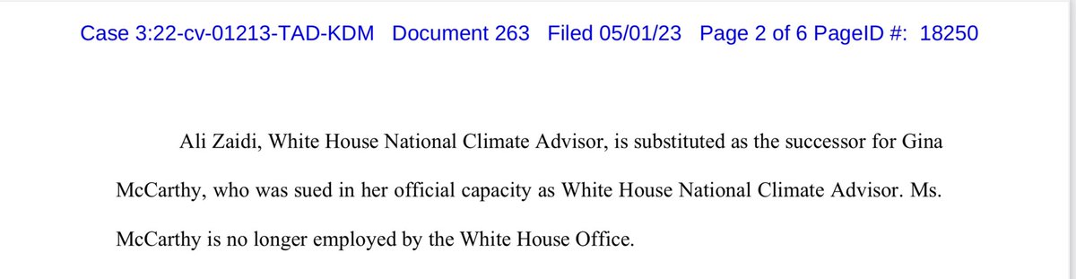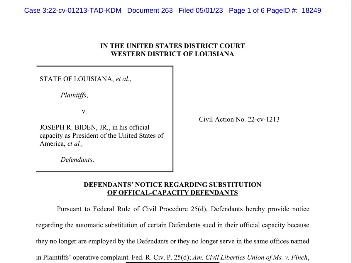 There has been an interesting filing in this groundbreaking censorship/1A case. The government has filed notice regarding the substitution of “official-capacity” defendants. What follows is SIX PAGES of replacements or terminations of defendants named in… twitter.com/i/web/status/1…