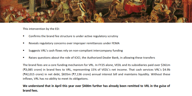 Our thesis rests on a simple but critical dynamic: VRL is a "parasite" holding company with no significant operations of its own, propped up entirely by cash extracted from its dying "host": $VEDL. This creates a self-destructive feedback loop. 3/