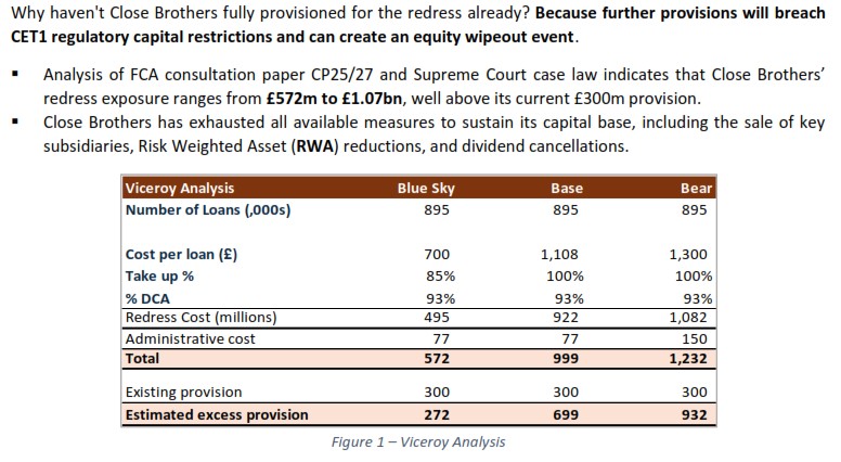Analysis of FCA consultation paper CP25/27 and Supreme Court case law indicates that Close Brothers’ redress exposure ranges from £572m to £1.2bn, well above its current £300m provision. $CBG 3/