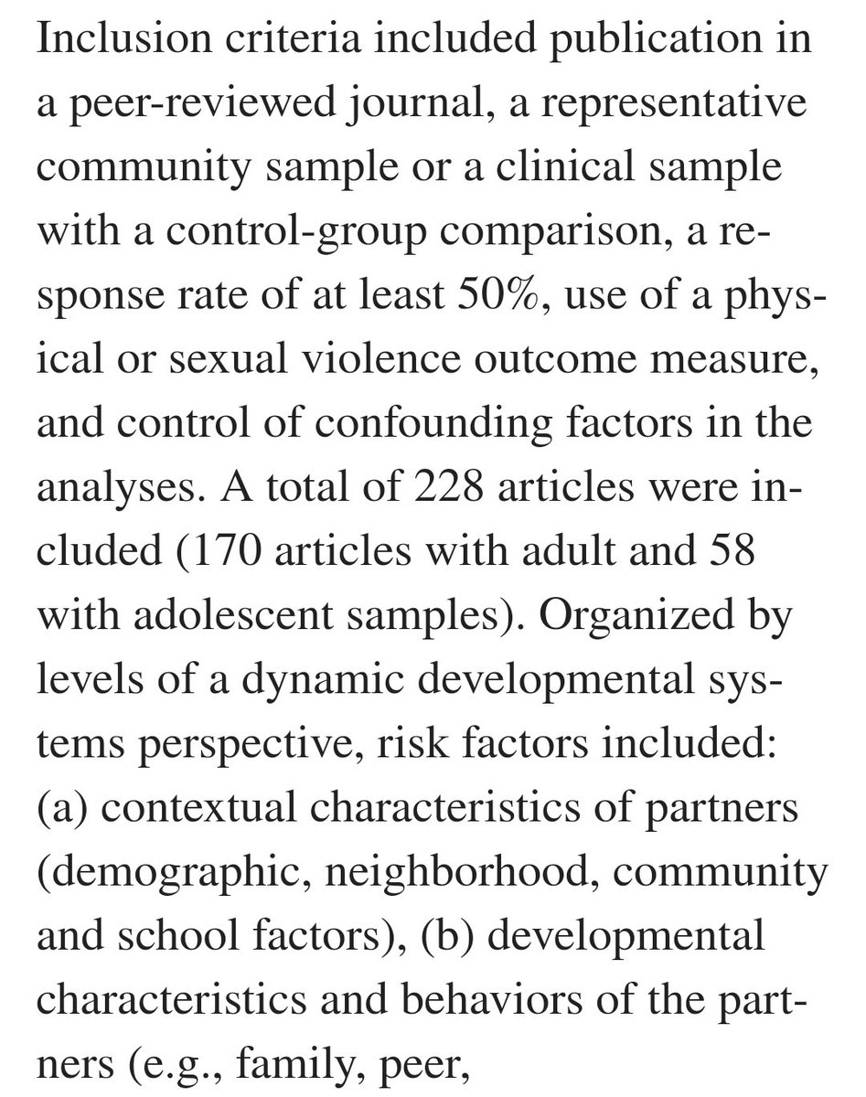 El estudio es fundamentalmente un metaanálisis con una muestra de 228 artículos científicos analizados (170 de ellos con muestras adultas y 58 de ellos con muestras adolescentes), en el cual se señala una amplia gama de factores de riesgo como causantes de la violencia +