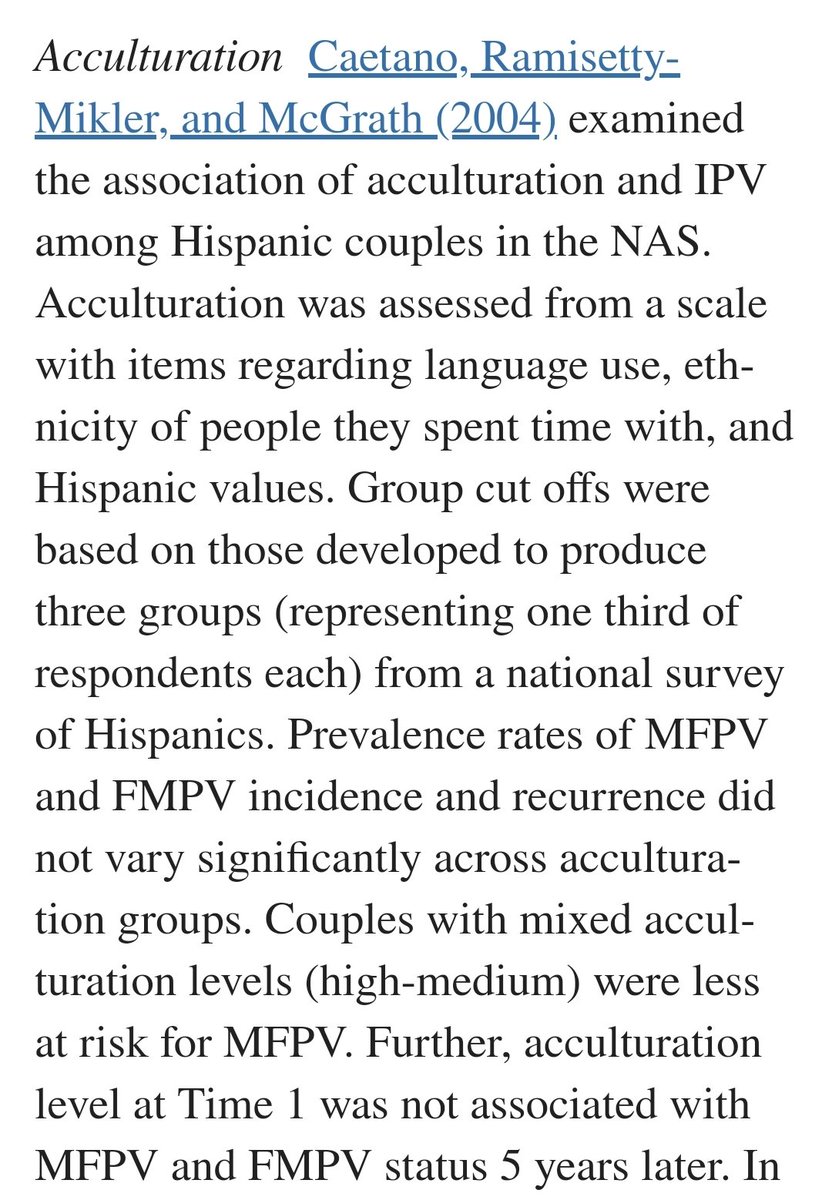 Incluso la aculturación en el caso de los hispanos en Estados Unidos es mencionada también como un factor de riesgo, haciendo que los hispanos de tercera generación tiendan a una mayor agresividad con sus parejas que los de la primera generación.