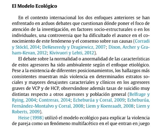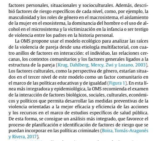 De este análisis, y hablo del modelo ecológico. Este modelo, propuesto por la OMS, establece la no centralización de la investigación únicamente en las causas individuales o únicamente en las culturales, sino que ambas pasan a tener su grado de importancia.