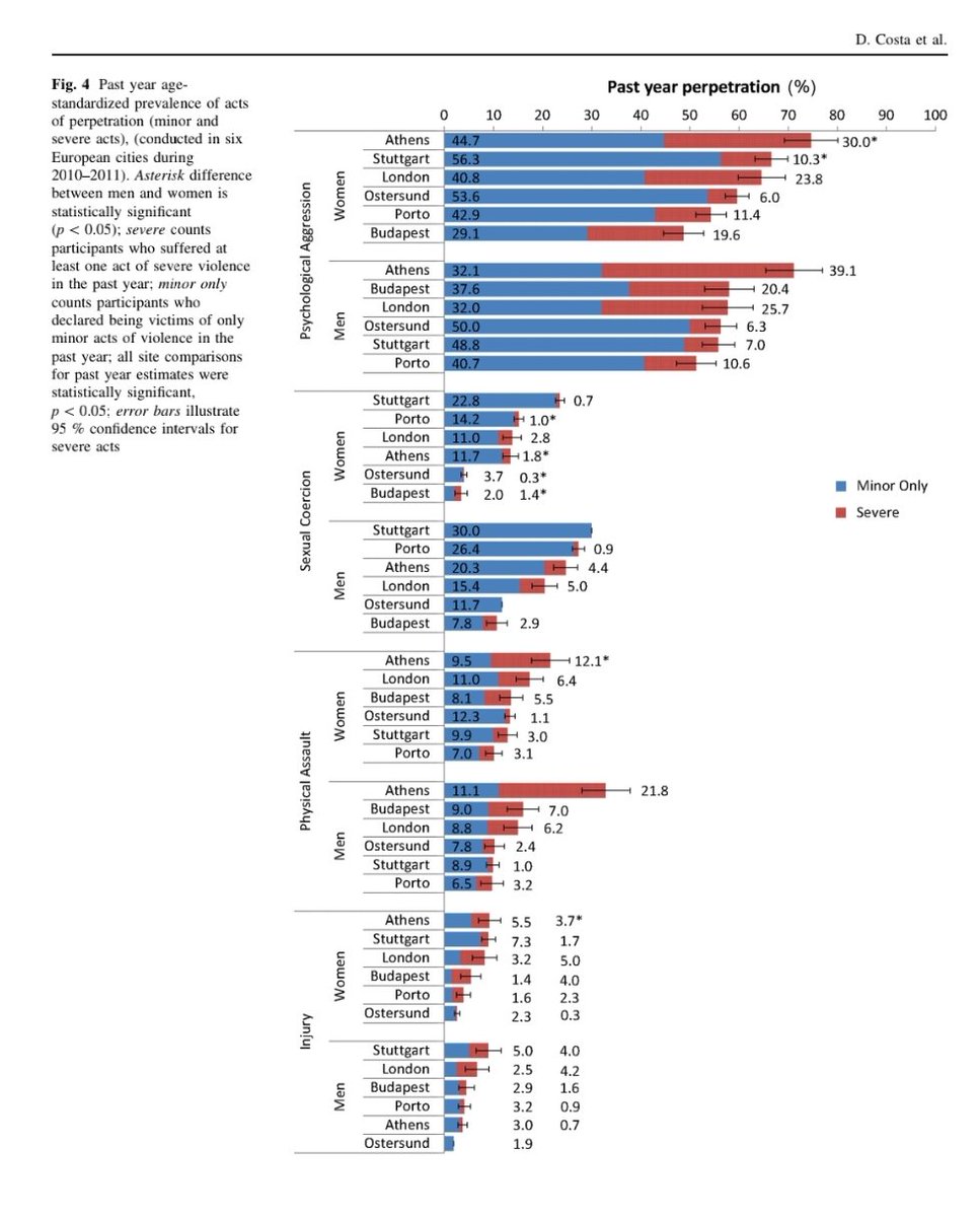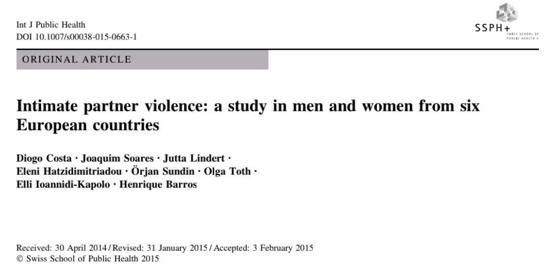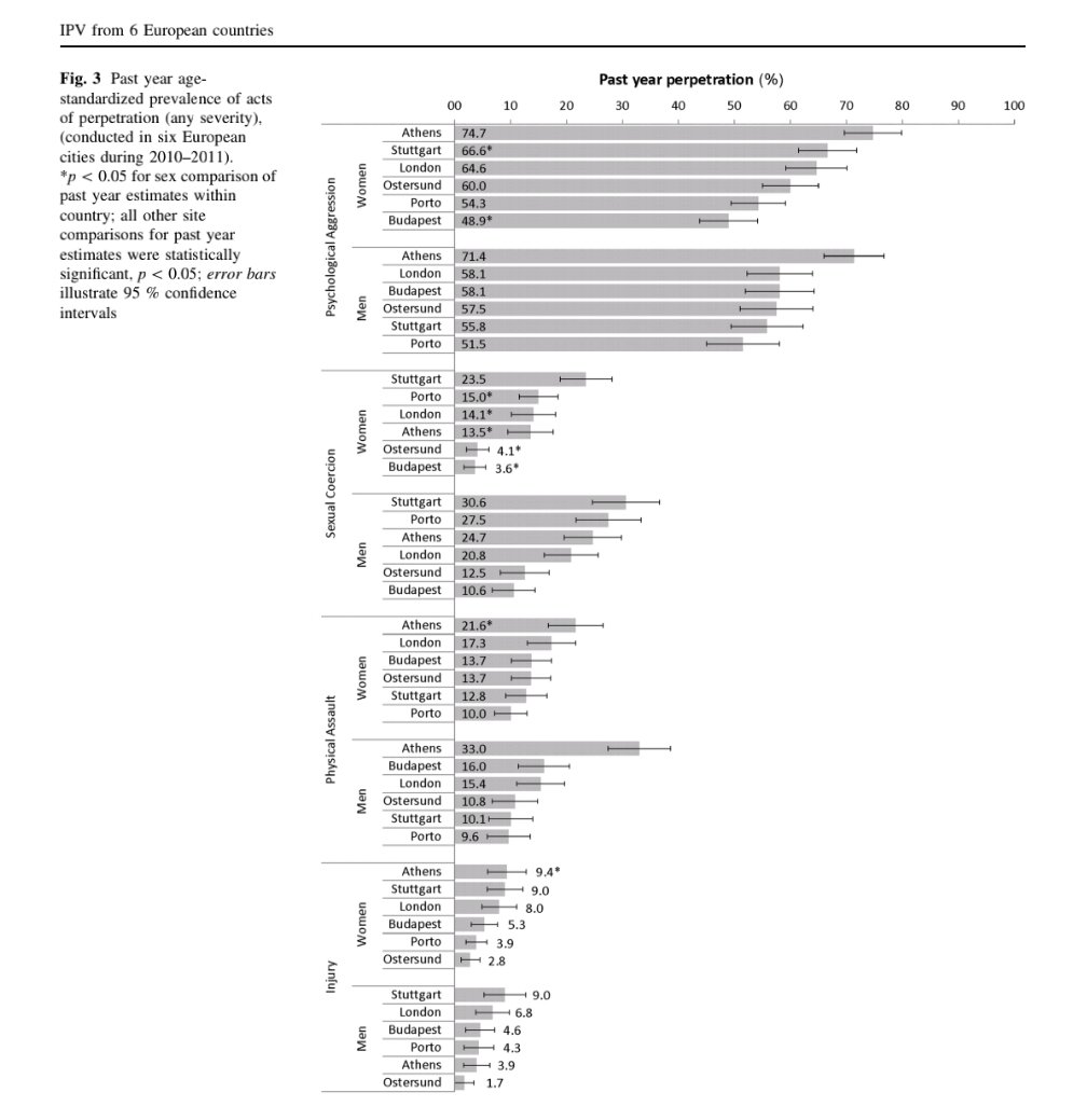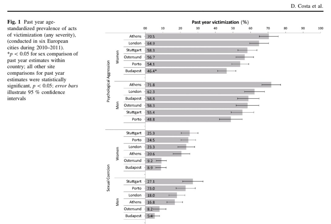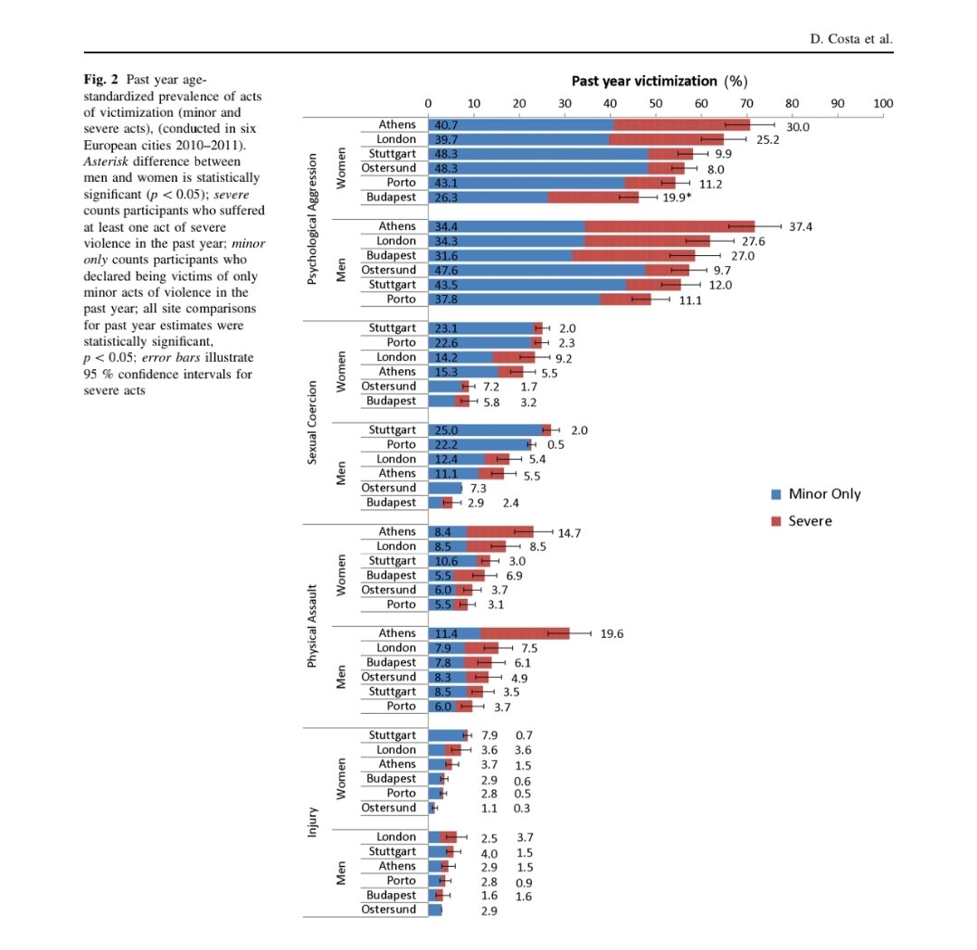 Por ejemplo, en este estudio de 2014 que estudia los resultados sobre diferentes formas de violencia doméstica en seis países europeos distintos usando una muestra con un n de 3.496 adultos de edades comprendidas entre 18 y 64 años, se muestra que la victimización por las +