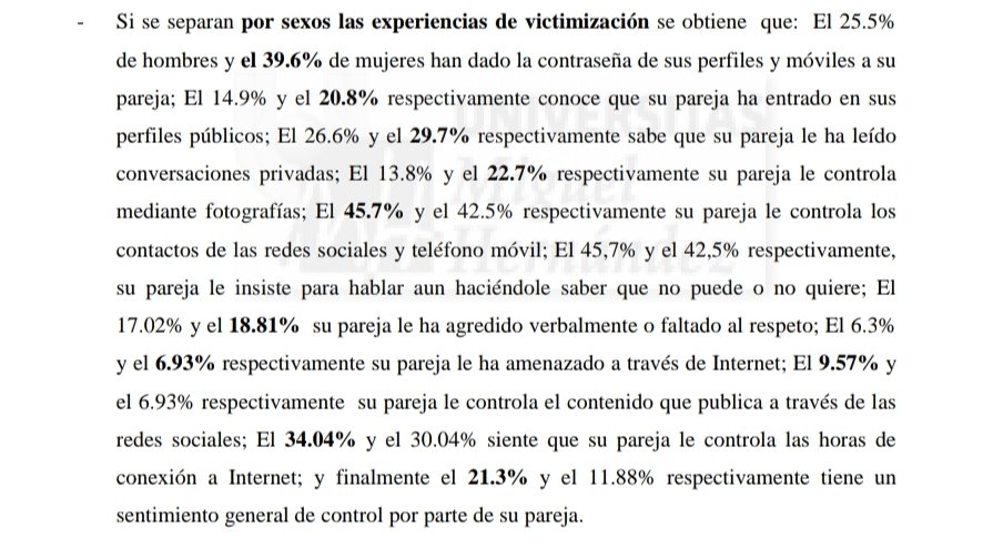 Por otro lado, es especialmente relevante la prevalencia femenina en las conductas de perpetración (acordaos de este estudio la próxima vez que veáis tipas por esta red social glorificar comportamientos celosos y de control), ya que en prácticamente TODAS ELLAS hay mayor +