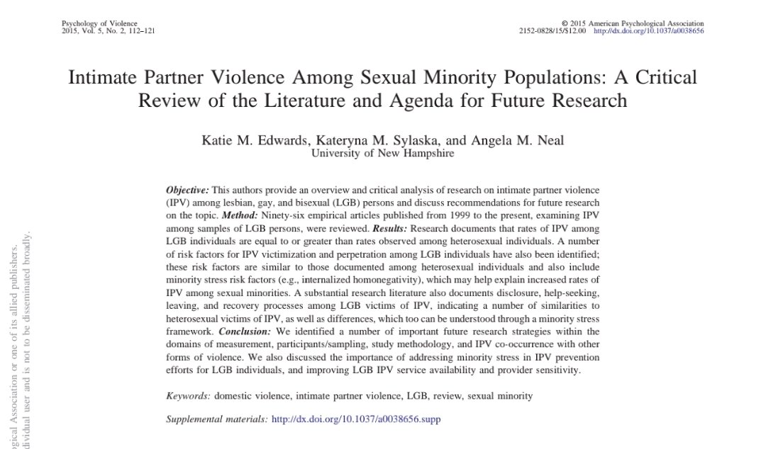 En cuestión de minorías sexuales (en este caso gays y lesbianas) tenemos este metaanálisis (que si lo llego a saber lo pongo en mi hilo del 25N). En este metaanálisis se analizan las tasas de victimización y perpetración en parejas integradas por personas del mismo sexo.