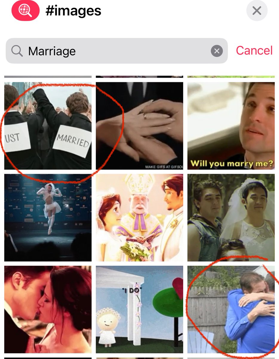 In iMessages, if you type in “marriage” into the GIF thing, half of the results are homosexual couple images. It’s almost like something unrealistic is being shoved into society to influence young people…