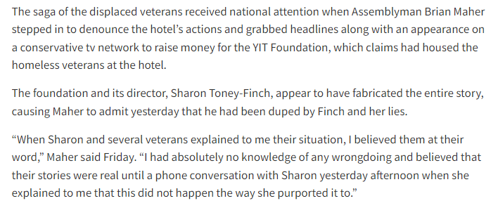 On Monday, Brian Maher appeared on Fox to talk about his "personal friend, an American hero" Sharon Toney Finch (who was the initial source for the story) and discuss the vets who were supposedly kicked out for migrants