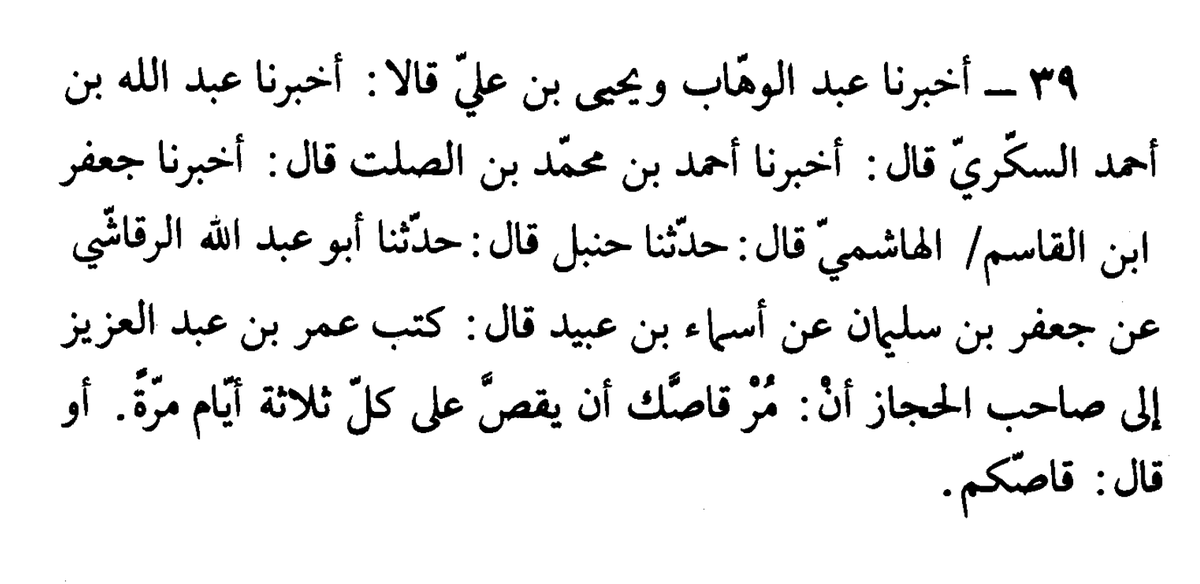 "Umar in Abdelaziz wrote to the ruler of Hijaz and ordered him: Tell your storyteller to tell stories once every three days"