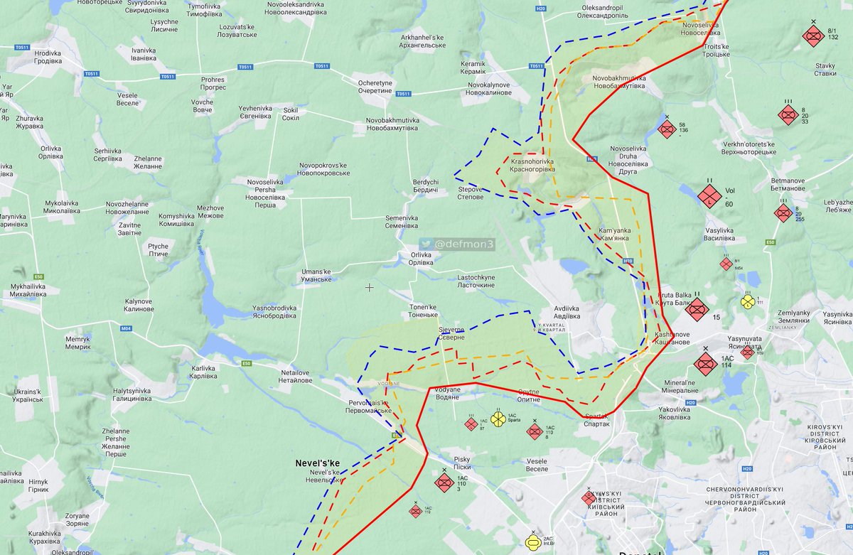 In an attempt to divert UA forces from Bakhmut, units from mostly RU 1st Army Corps attempted to encircle Avdiivka during March - April. AFU lost Krasnohorivka and Kamyanka in the north but managed to hold on to the sentiments in the south.