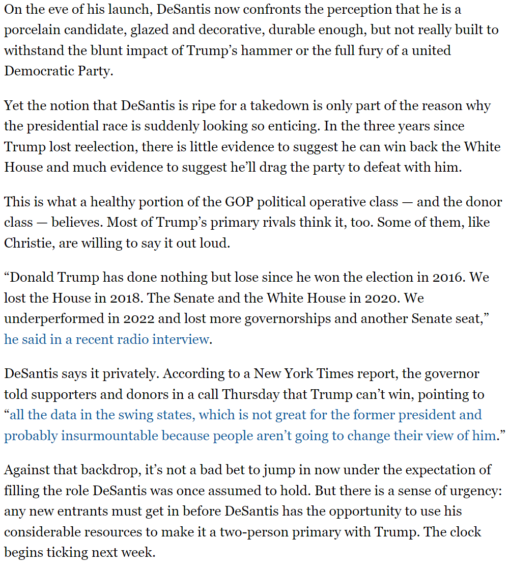 One paragraph: Sununu, Burgum, and Christie are thinking about running for president. Two paragraphs later: No one runs for president without "a detailed and plausible path to victory." That is a self-refuting argument. No such path exists for those three, and everyone knows it.