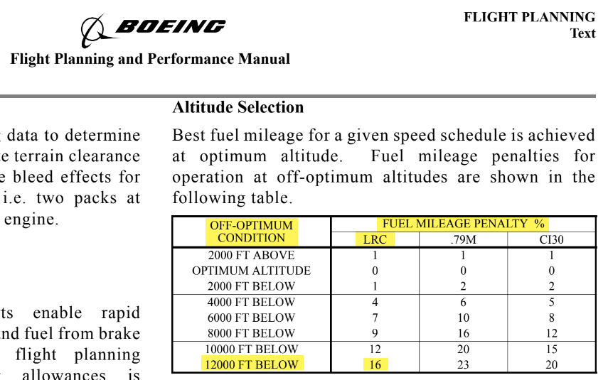 [4] Según Boeing si el 737-800 vuela a 12.000 pies por debajo de la altitud óptima el alcance se reduce en un 16% (siendo conservadores y considerando que se mantiene la velocidad de crucero de largo alcance, a otras velocidades la reducción de alcance podría ser incluso mayor).