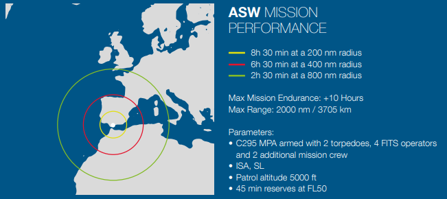 [8] A una distancia de 400 millas náuticas un C295 MPA en config ASW puede permanecer 6,5 horas patrullando a 5.000 pies. Esto querría decir que un C295 puede estar más tiempo que un P-8 patrullando a 5.000 pies a una distancia de 400 nm (6,5 horas vs 4,6 horas).