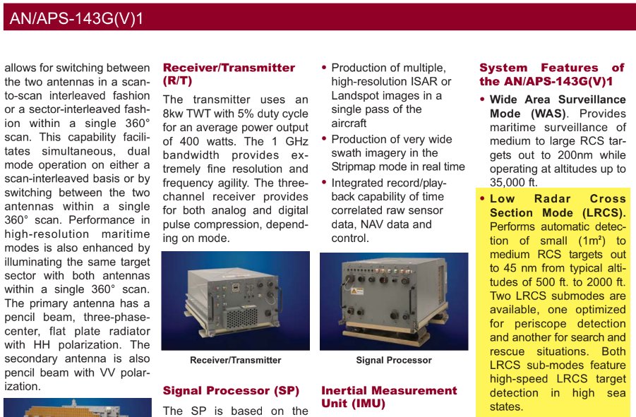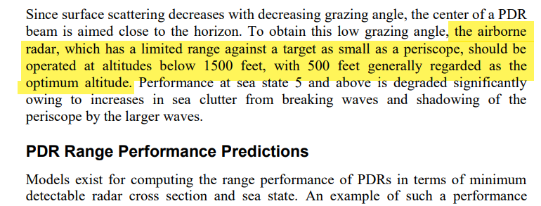 [13] Detección de snorkels: La altitud idónea de detección de snorkels es entre 500 y 1500 pies, para evitar el ruido del clutter de la superficie marina. A más altitud la altitud la detección, ya de por si difícil, se vuelve prácticamente imposible. apps.dtic.mil/sti/pdfs/AD100…