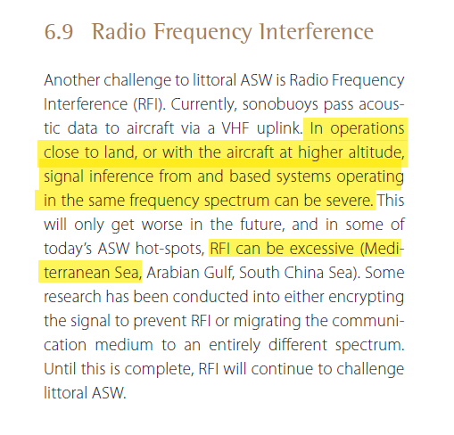 [17] Las sonoboyas transmiten a baja potencia en VHF sin ningún tipo de encritación, por lo que su señal es fácilmente perturbable. Es una de las preocupaciones señaladas por el JAPCC de la OTAN. Se debe volar bajo, cerca de las sonos y fuera del horizonte radio de los jammers.