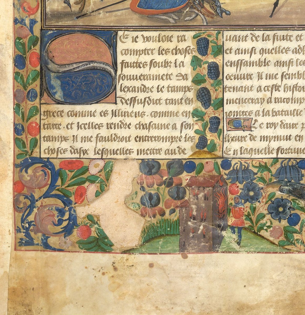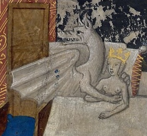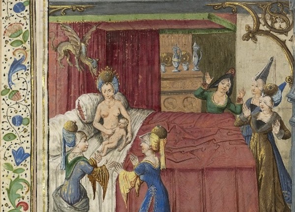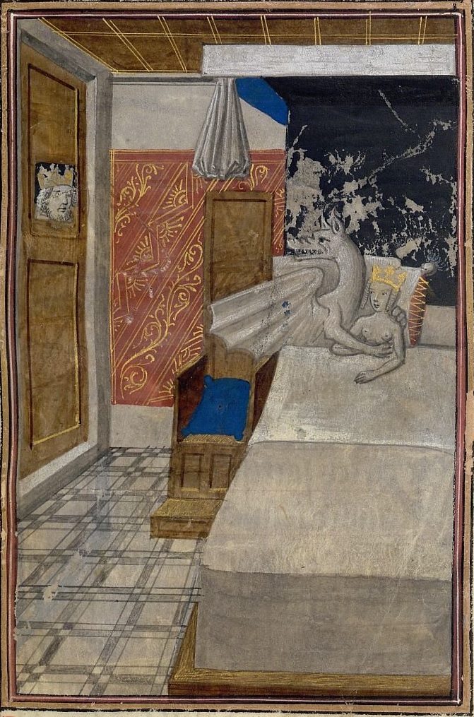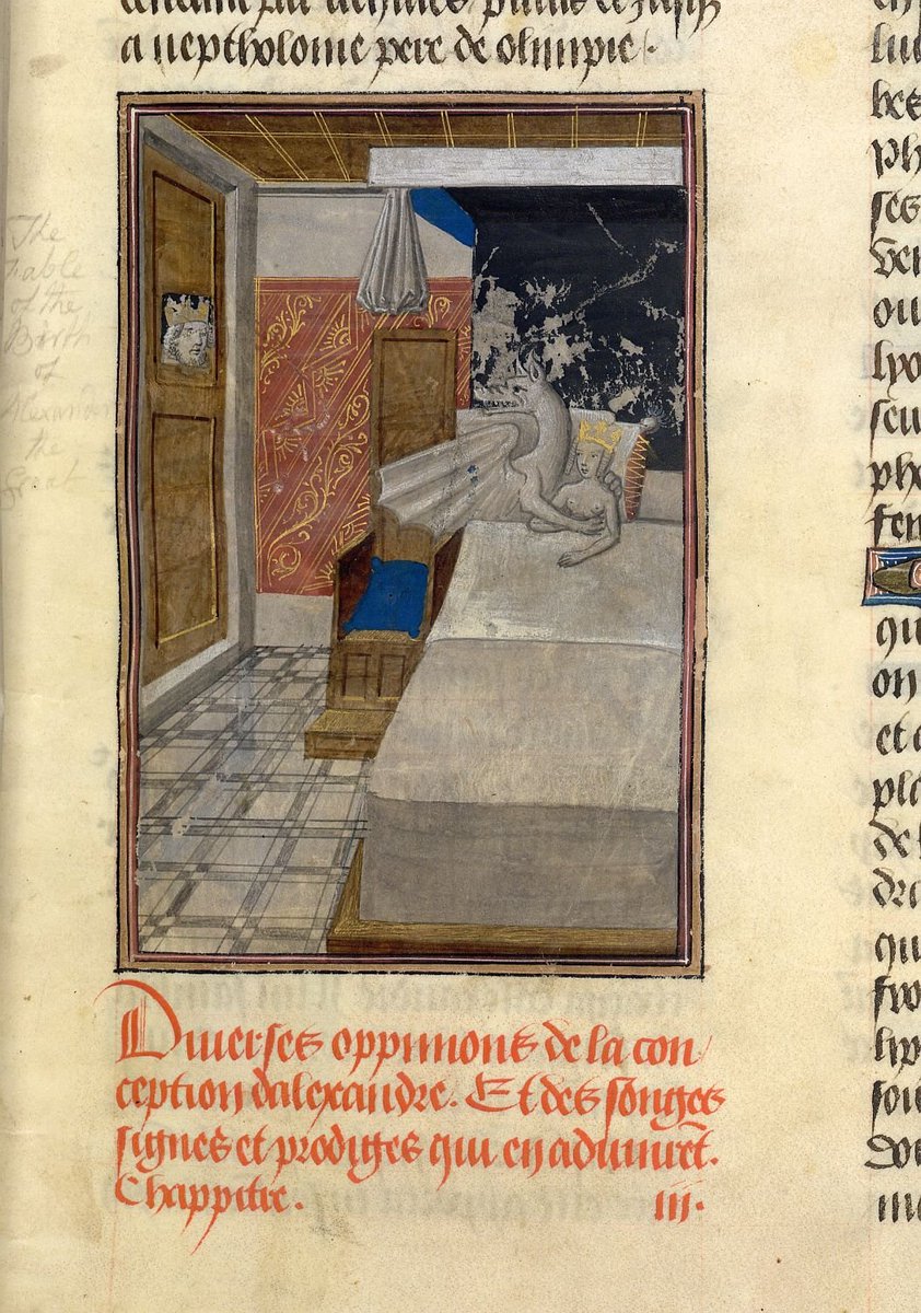 Poczęcie Aleksandra Wielkiego, Les faize d'Alexandre, zamieszczone w przełożonej ok. 1468-1475 na j. francuski książce Historiae Alexandri Magni (Brugia, Biblioteka Brytyjska, Burney 169, fol. 14r), którą po łacinie spisał Quintus Curtius Rufus w I wieku n.e., a przetłumaczył