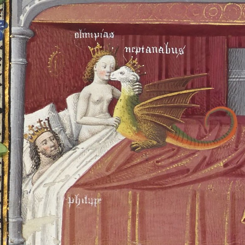 zinterpretowała jako boga Zeusa-Amona. Plutarch uznał, że sen Filipa wskazywał, że Olimpias odprawiała bachiczne rytuały z wężami... W w Księdze uczynków Aleksandra Wielkiego jego matka trzyma nowonarodzonego Aleksandra, podczas gdy smok wchodzi na jej łóżko z lewego górnego rogu