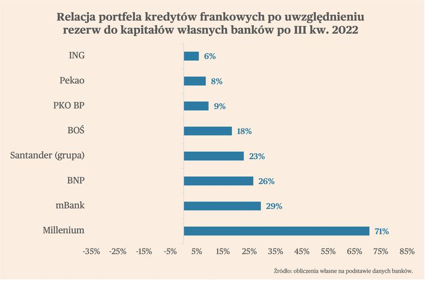 Relacja portfela frankowego kredytowego do kapitałów banków jest bardzo nierówno rozłożona i mowa jest o problemach kilku z nich, szczególnie jednego. I ten jeden dziś rzeczywiście bardzo mocno traci na giełdzie. Inne różnie: niektóre dość mocno, inne nie.