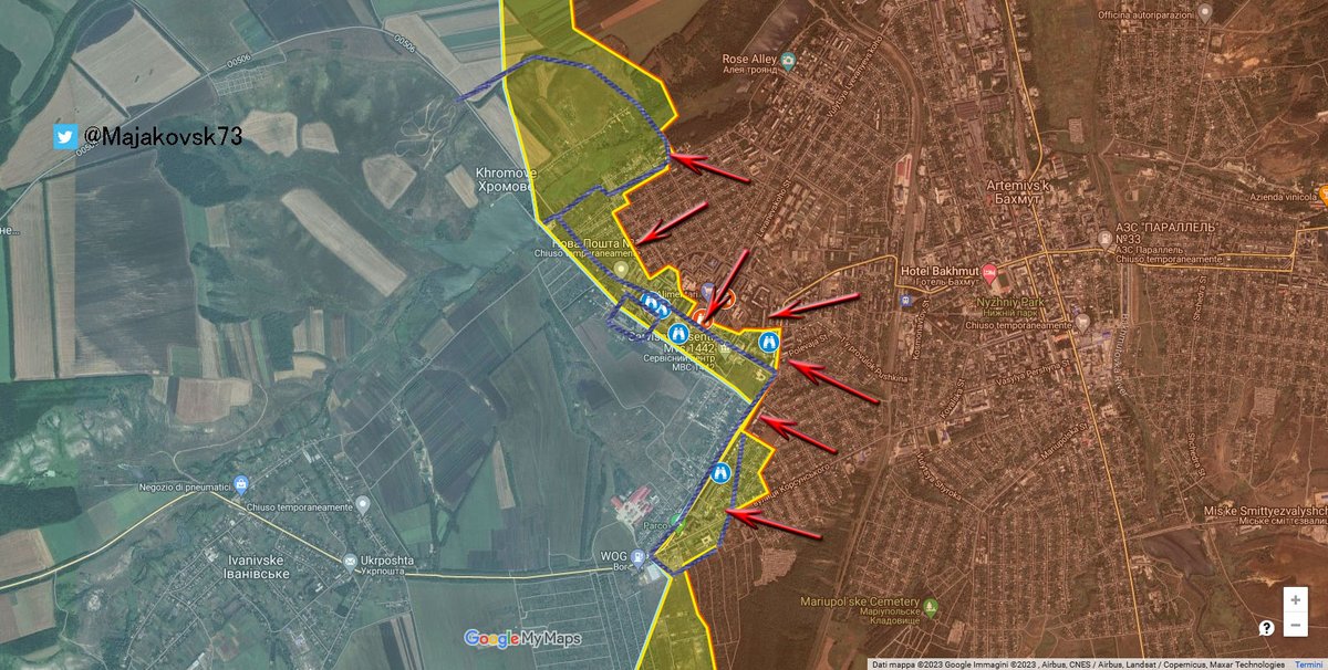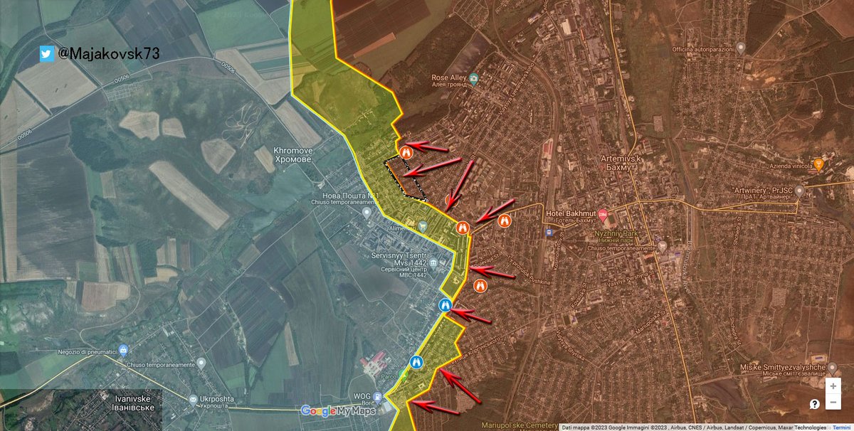 2\#Ucraina che hann smentito di fatto le voci della caduta di Bakhmut. Tra l'altro tutto nasce dalla mappa pubblicata dalla wagner che ha messo una zona "gialla" a sud della cittadella (dove si stanno concentrando attacchi). Zona gialla che da contesa è diventata "controllo"