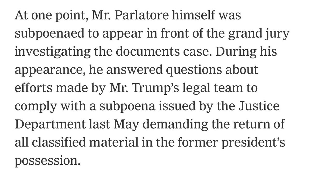 Also new: Parlatore WAS subpoenaed by Jack Smith. Previous reporting says he went VOLUNTARILY. And he was kind of a cocky dick about it. Check out what he told CNN. Then see the brand new NYT report saying he was subpoenaed. So that’s fun! 2/