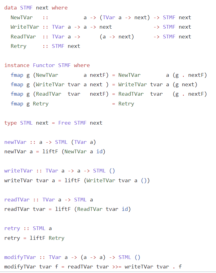 The same is true for the 'bind' function - the essence of every monad. For the Free monad, my monadic binding should traverse a monadic STML scenario (transaction) and join it with another STML monadic scenario (transaction) thus having the final monadic STM scenario.