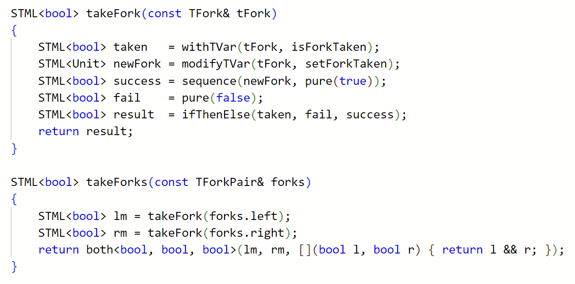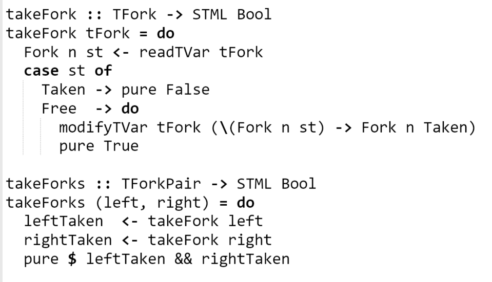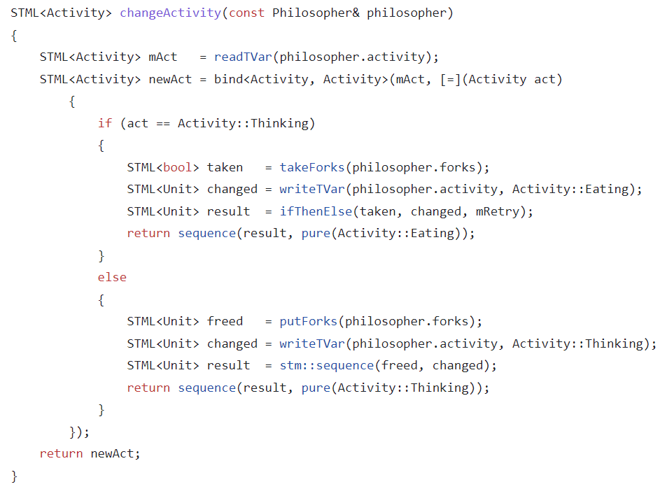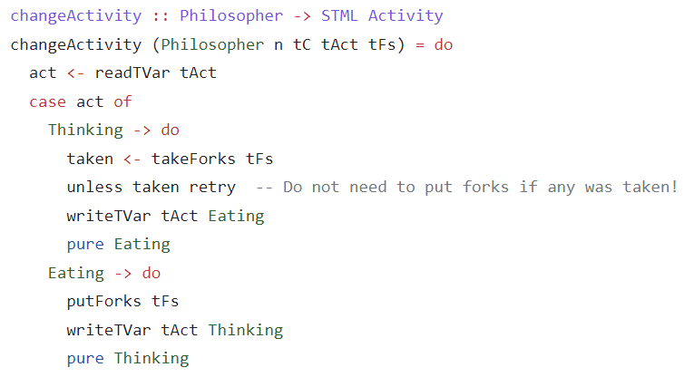 In the pictures, a classic concurrency problem known as "Dining Philosophers" is solved in both Haskell and C++ with custom STMs I made.
