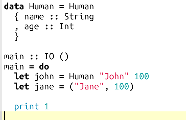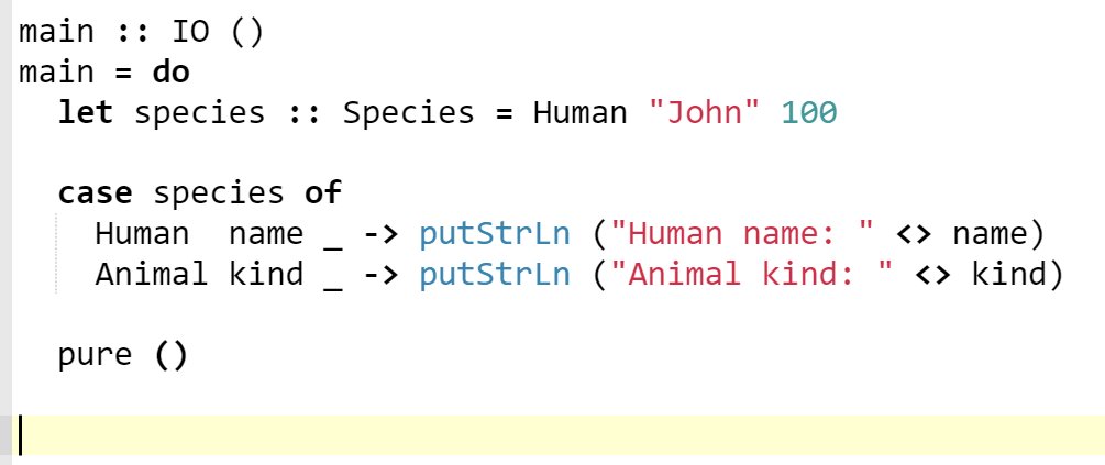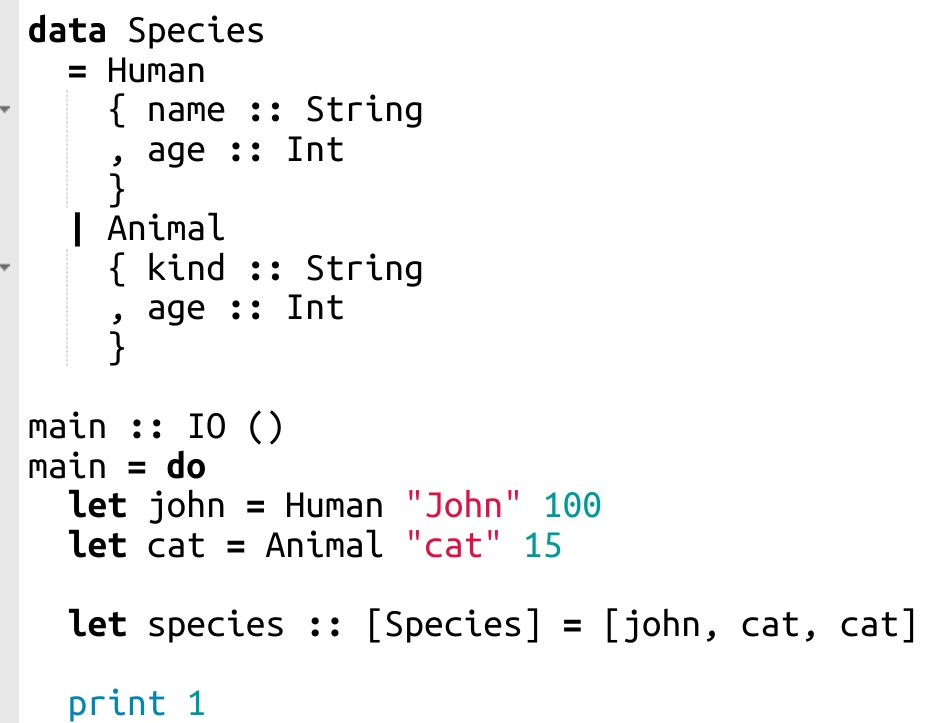In Haskell, there are no Human and Animal types. They are value constructors (aka object constructors in C++) of the Species type.