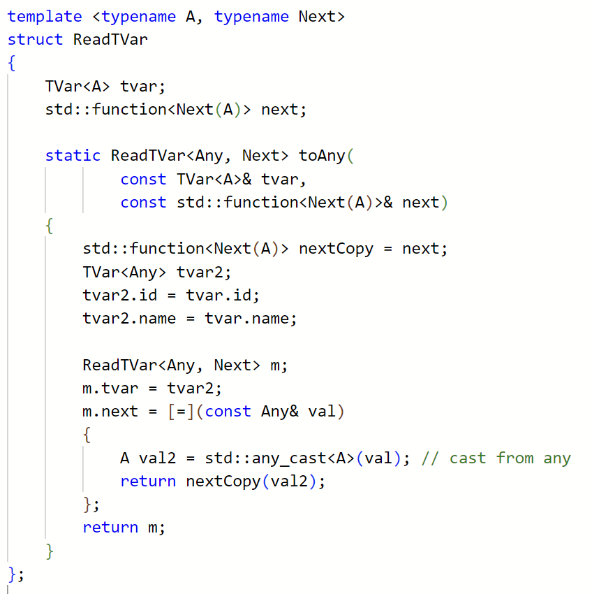 Notice the std::any type. This type helps to work with unknown user types uniformly.