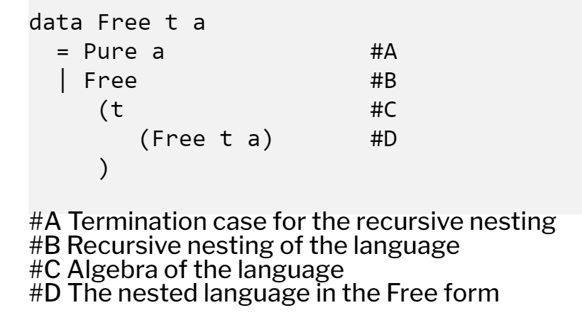 This straightforward Free ADT has two constructors: Pure and Free. And it's generically recursive.