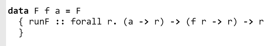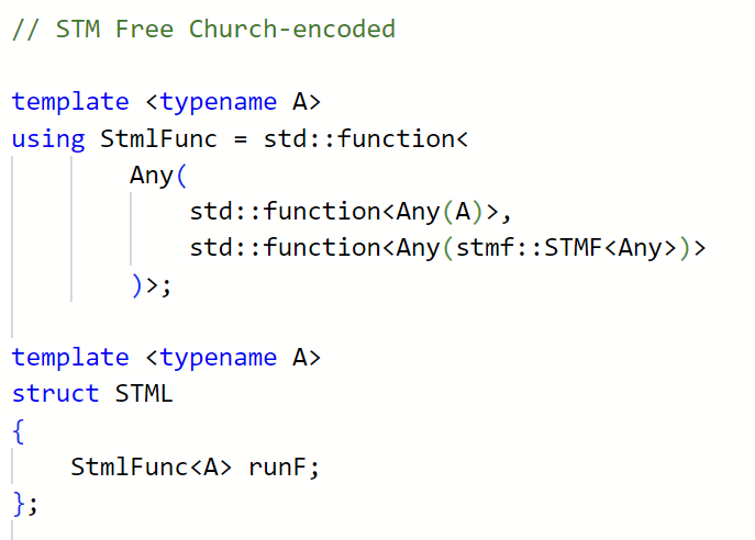 Church-encoded Free type is much more tricky. It represents one big complicated continuation (function) that has the ability to join (bind) two separate actions of my STMF eDSL.