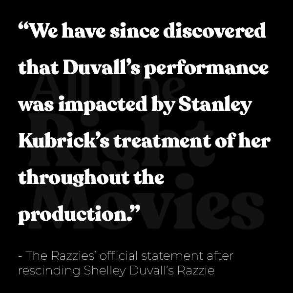 The Shining received no Oscars recognition but at the Razzies, Kubrick was nominated for Worst Director and Shelley Duvall received the honour of a Worst Actress nomination. (Duvall’s nomination was rescinded in 2022.