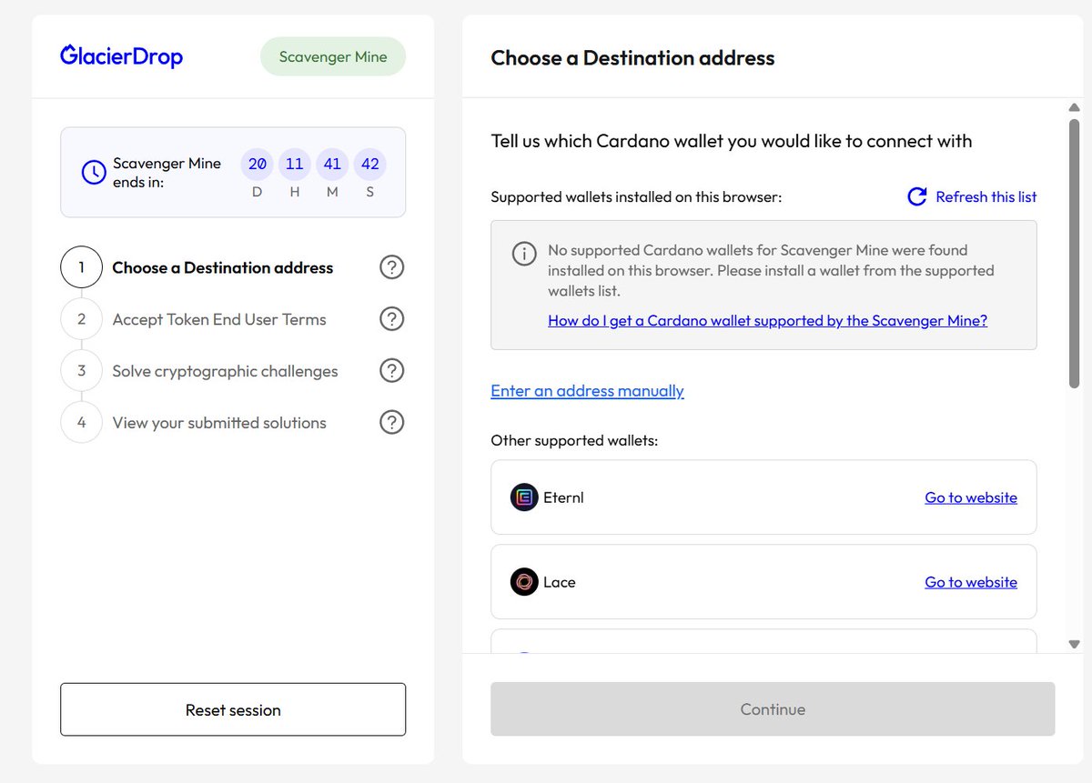 - Choose the wallet you use, or created, or enter the address manually. You will need to sign a transaction without a fee in the next step. midnight.gd