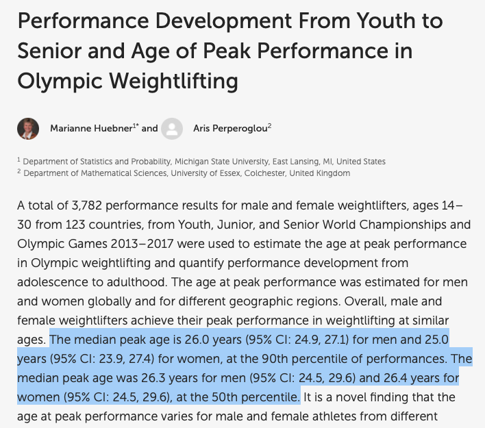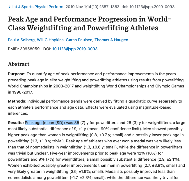 Pokud se podíváme na kulturistiku a silové sporty, tak se vrchol soutěžní/závodní kariéry značně prodlužuje. Siloví trojbojaři mají silový peak průměrně ve 35 letech.