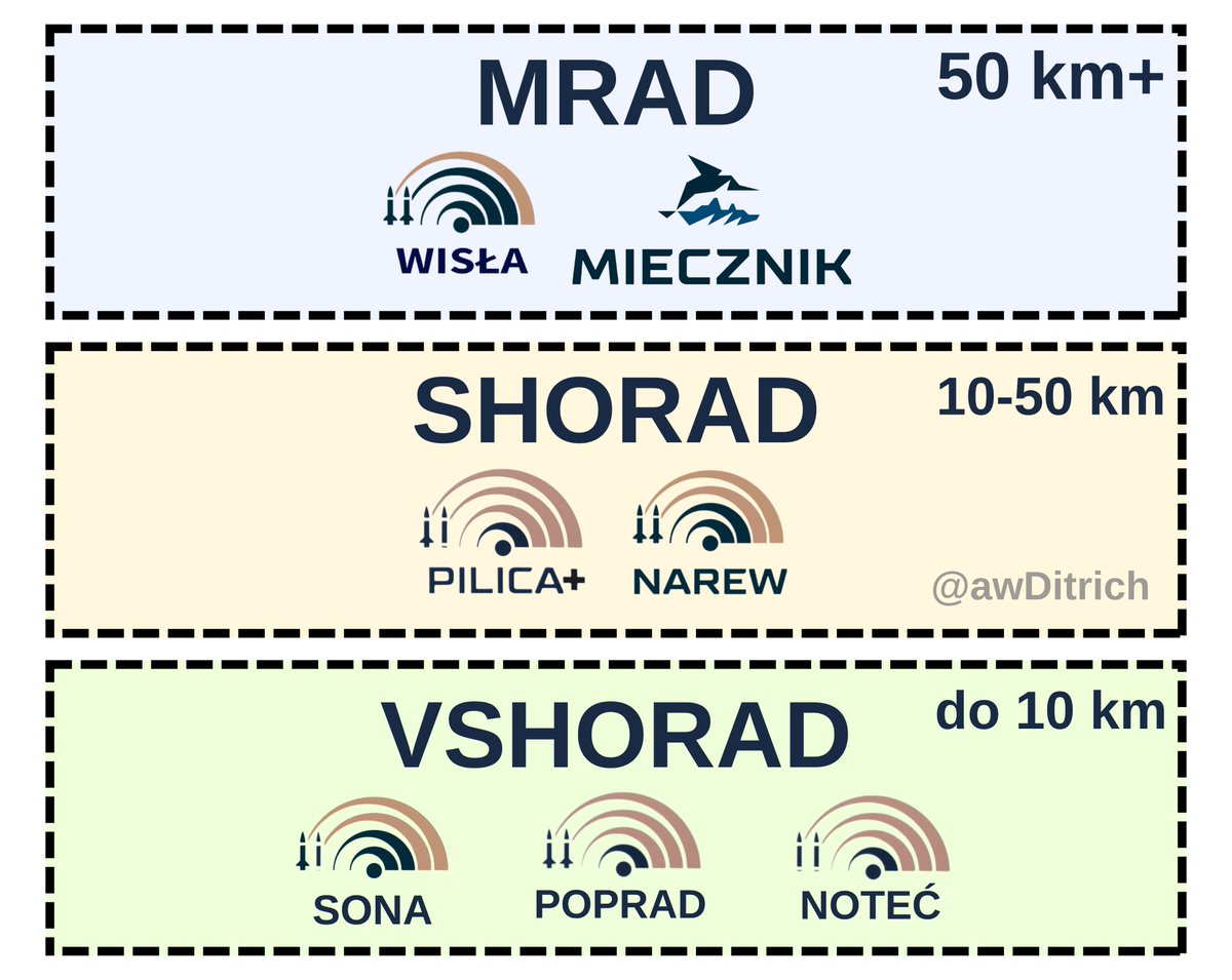Najniższa warstwa (VSHORAD) ma przede wszystkim chronić bezpośrednio jakieś obiekty lub jednostki. Warstwa SHORAD i MRAD ma już charakter obszarowy. Ich strefy odpowiedzialności będą się zazębiać. Jeden obszar będzie mógł być chroniony przez elementy Pilicy, Wisły i Narwi. 3/n