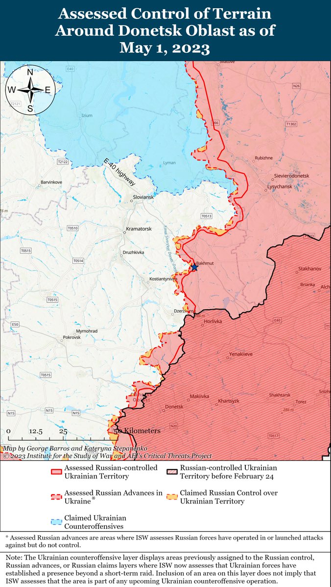 Ukrainian military officials reported that Ukrainian forces control an “insignificant” part of southwestern Bakhmut City around the T0504 highway — a tacit acknowledgement that Russian forces have secured the rest of western and northwestern Bakhmut, if not all of it.