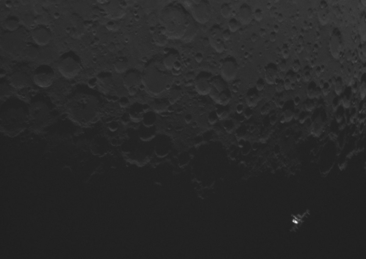 Yesterday afternoon I captured a fleeting moment- the moment the ISS transited the moon. Despite being broad daylight, the ISS was clearly visible against the cratered terrain.