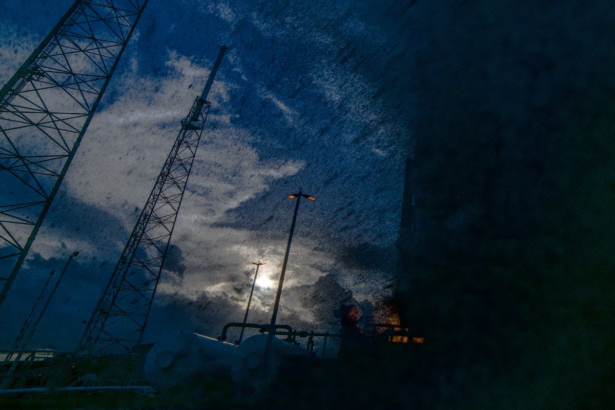 This photo was taken right when engines ignited, several seconds before the rocket started lifting off. In this moment my camera was sprayed with dirt, debris, and water.