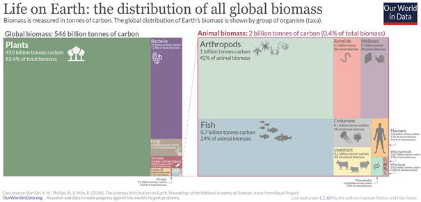 3/ Let me start with some measure of life on Earth (using common biomass metrics), largely dominated by plants overall and fish among animals.
